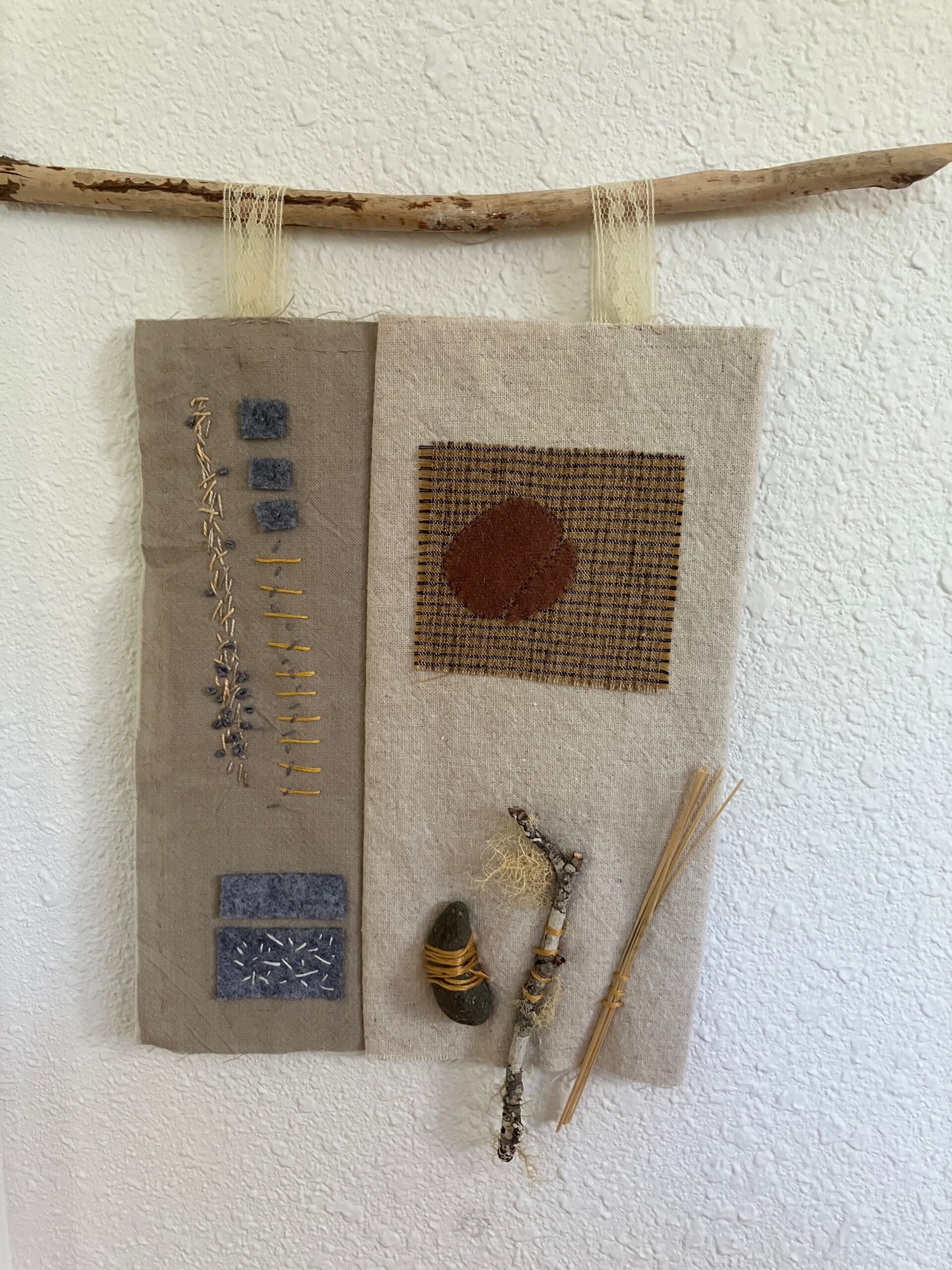 Nicki Eybel is a newly retired early childhood educator. She is now a mixed media collage artist, lately focusing on abstract stitching. As a member of the Columbia Fiber Arts Guild, she is active in the Handstitching Group and has enjoyed a daily stitching practice for the last 2 years. She has exhibited in local locations. She earned her Stitching Badge as a Girl Scout long, long ago.